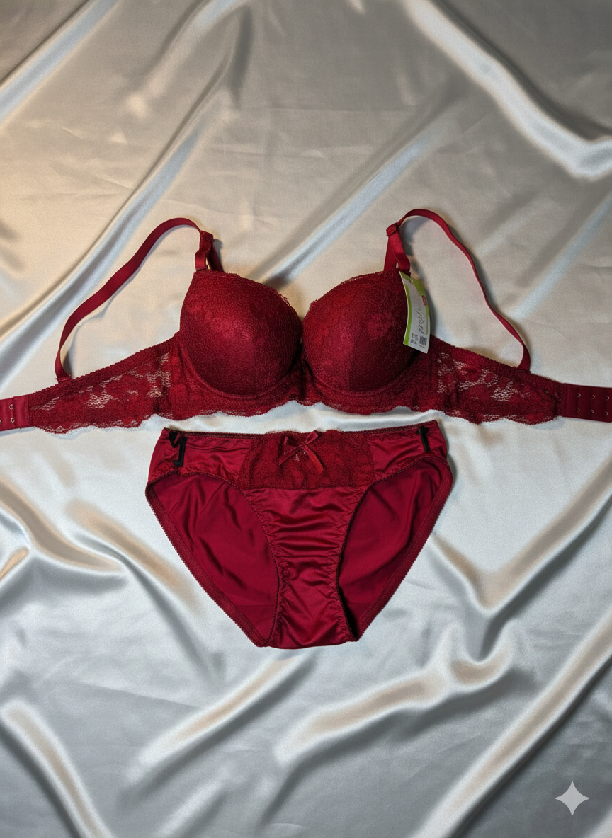 Bra me perfect padding aur strong support hai, jo aapko elegant shape deta hai. Matching panties ke sath yeh set honeymoon, wedding night aur special occasions ke liye best choice hai. Red color passion aur elegance ko represent karta hai, jo bridal wear ke liye ideal hota hai.